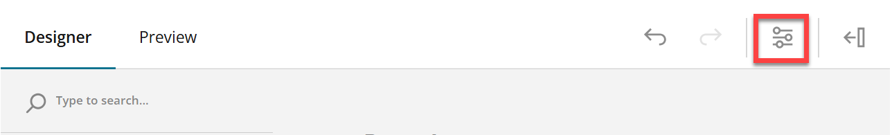 In the Designer view, click the settings icon outlined below to open the form level configurations panel.