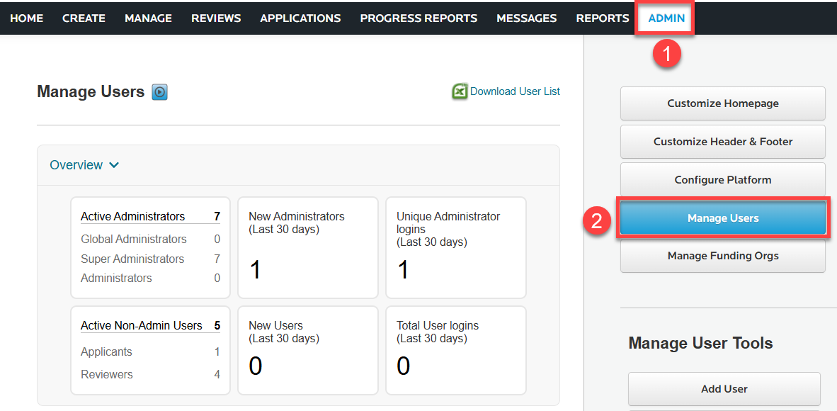 Notes: - You will rarely need to add Applicant or Reviewer accounts this way. Applicants are added to the system automatically when they click Apply for the first time to an opportunity. Reviewers are added to the platform automatically when they are assigned their first review. - If Global Admins need to be changed to a Super or Regular Admin, please submit a support ticket.