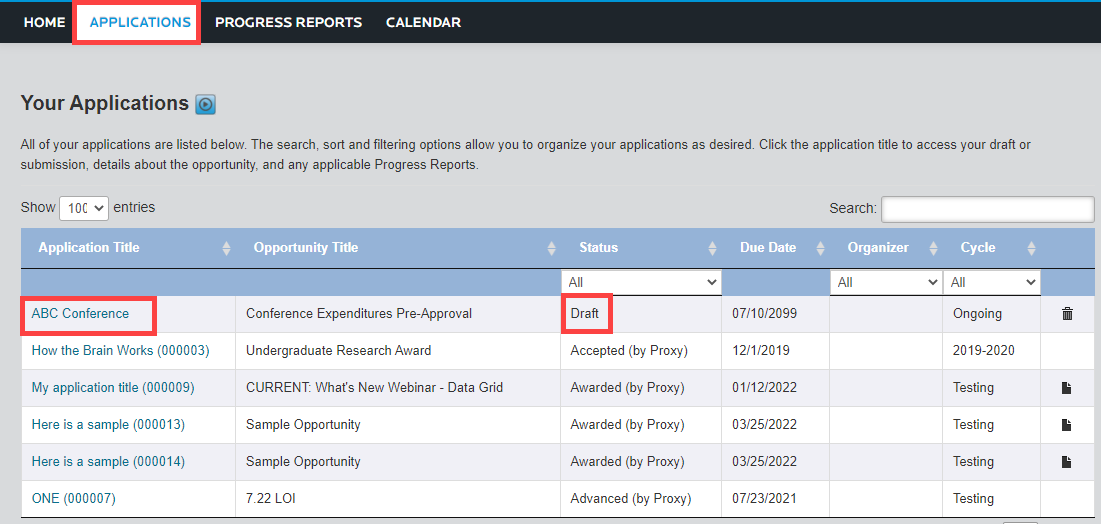 You may not be able to re-submit your application if the deadline has passed. If you encounter a situation where the deadline has already passed, please contact the opportunity administrator. Click on your application title and then Details to see the name of the administrator. This person will need to either: