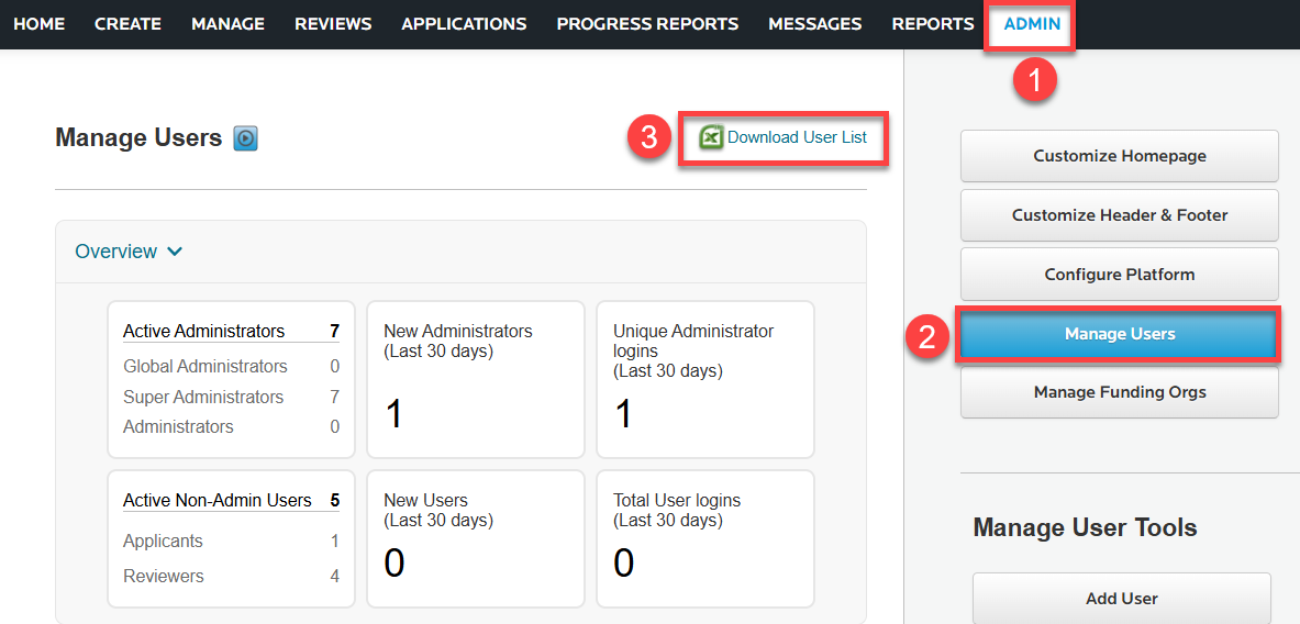1. Administration tab highlighted in red outlined box. 2. Manage Users blue button highlighted in red outlined box. 3. Download User List link with Excel icon next to it highlighted in red outlined box.