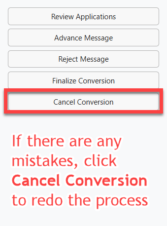 Note: Rejected applicants (those not advancing) will be notified immediately after finalizing the conversion (see Step 8 below).