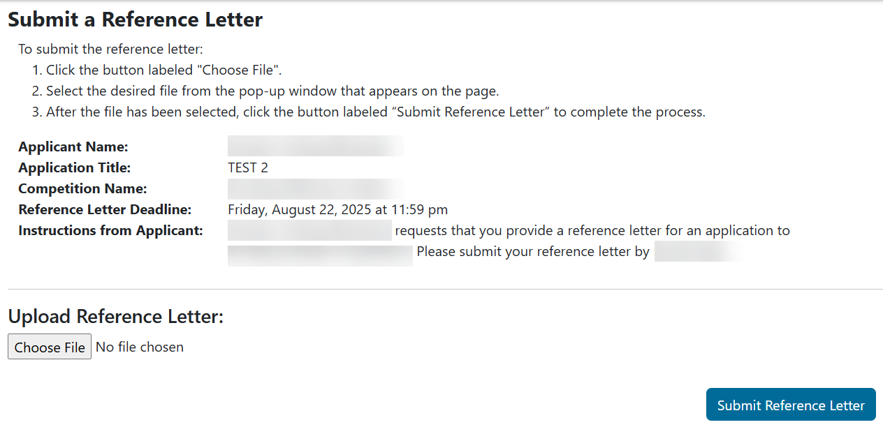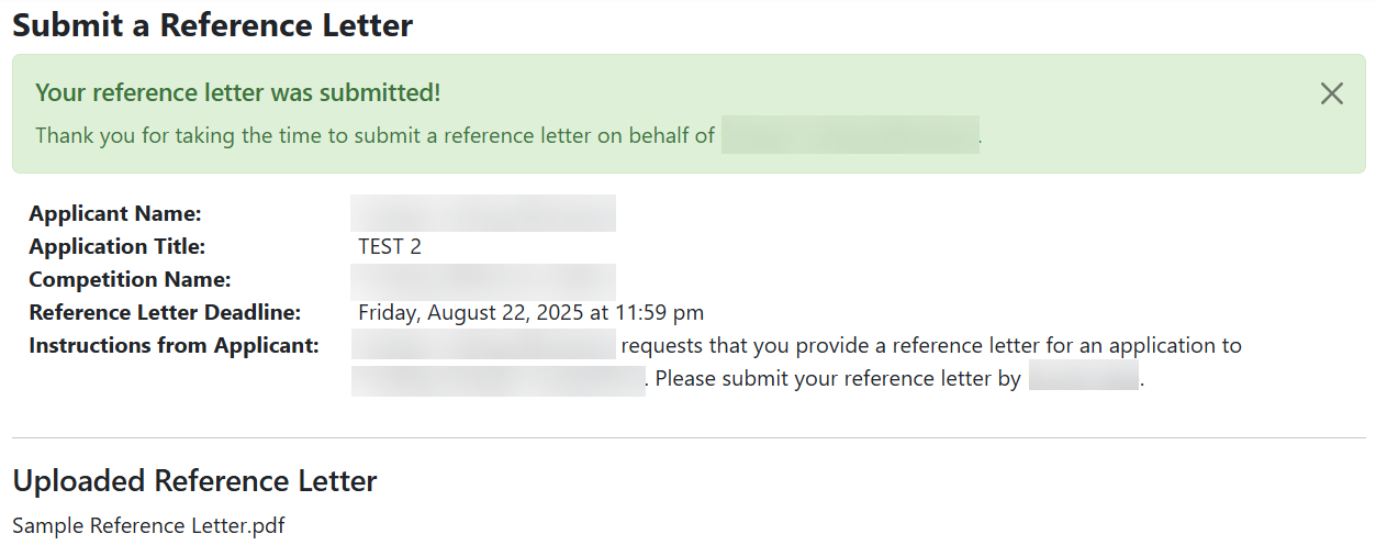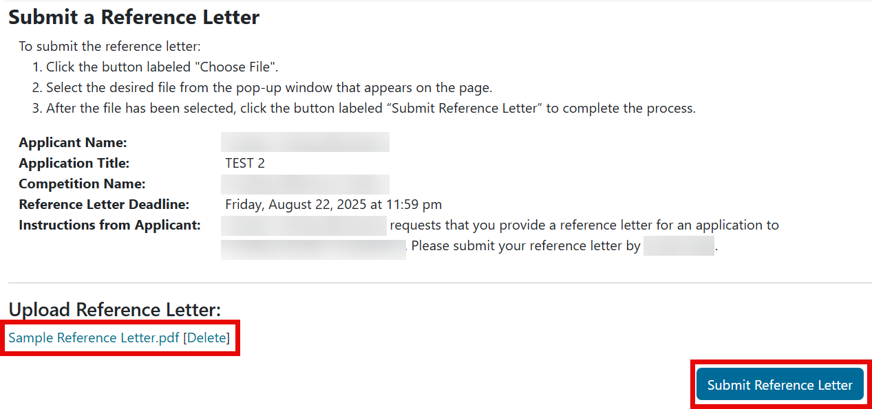 After the letter is uploaded, the file name will appear on the screen, and all they have to do is click Submit Reference Letter: