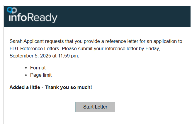 When an applicant requests a reference, the letter writer will get an email that lists who requested the letter and when it is due. It may also include notes about the content or length of the letter. An example letter request is shown below.