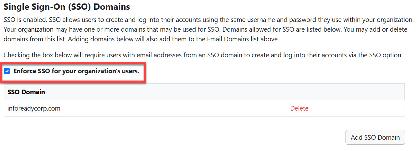 - If you have enabled SSO, Super Admins (or Global Admins when microsites are enabled) can choose to require that user accounts with email addresses containing email domains associated with the SSO to log in via SSO.