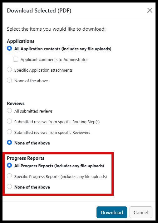 Administrators can download progress report contents in PDFs by using the Batch Actions menu of the Data Grid.
