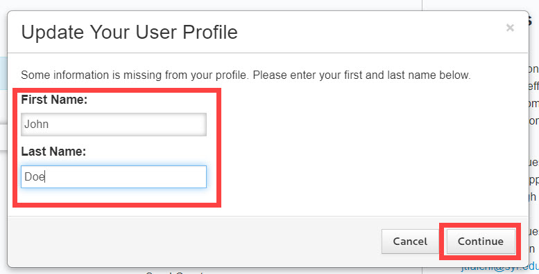 Users without first or last names currently listed in their profiles will be prompted to enter them upon logging in: