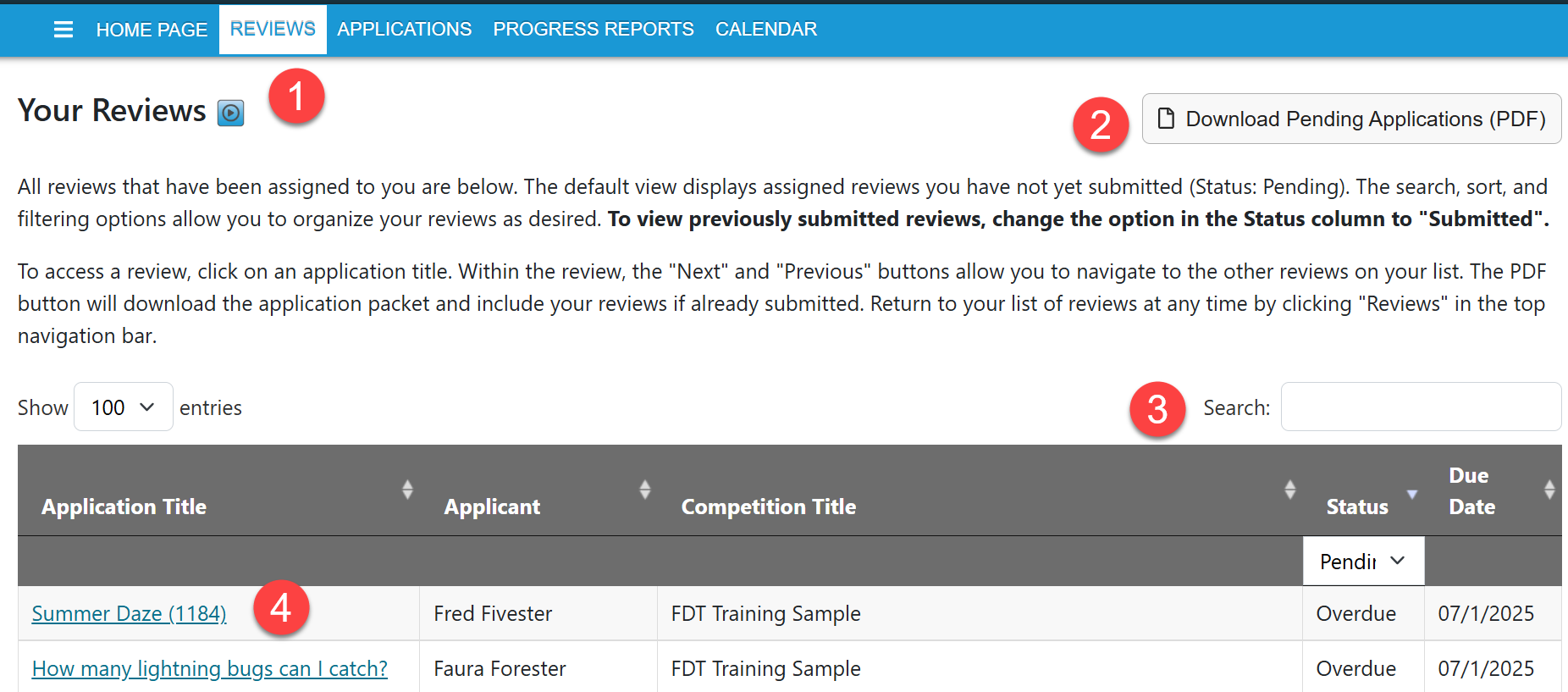 1. Instructions - The default view for the page is to show reviews that a reviewer needs to take action on. Click the blue square play icon for a link to a video on the Reviewer experience.