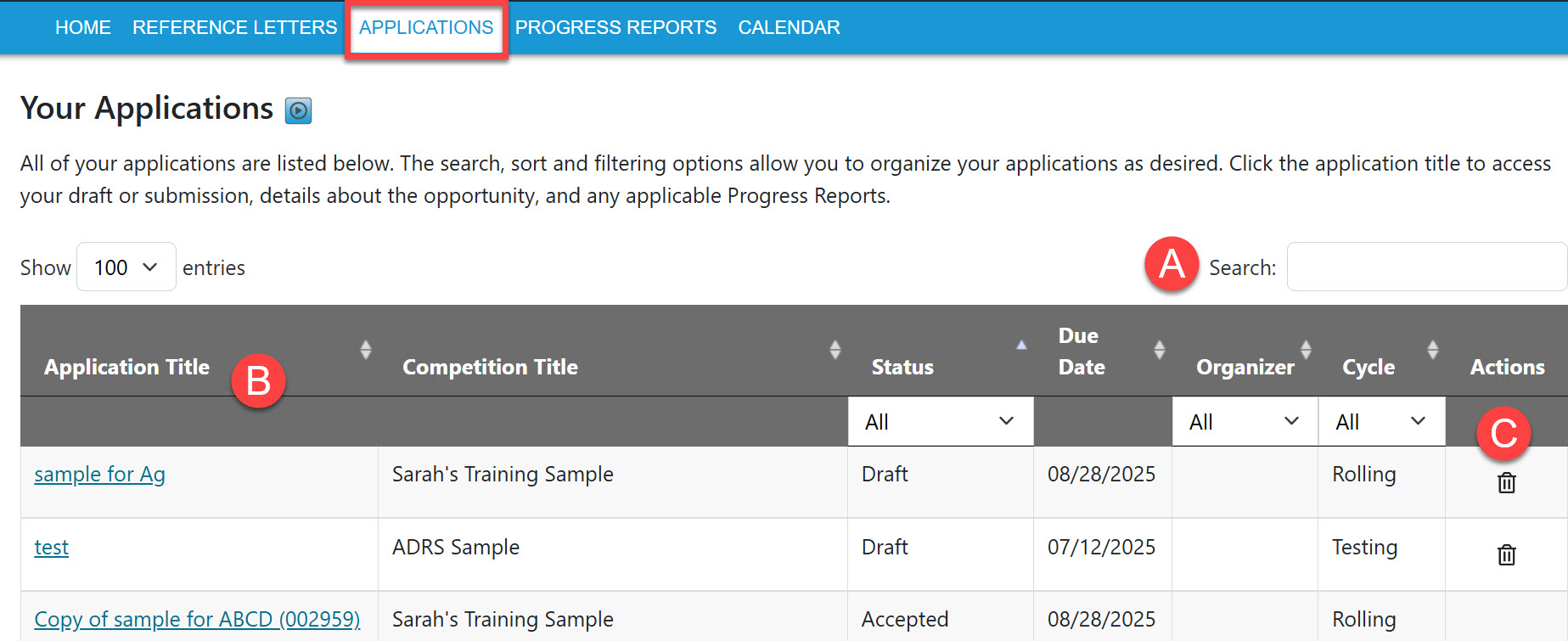 A. Table - Search, sort, or filter the table as needed to find a draft or completed application. View this article for a list of all possible application statuses.