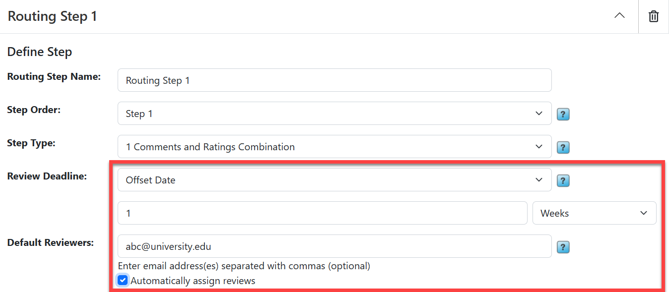 - If the same individual(s) will review all submissions for a particular step, enter their emails and check the "Automatically assign reviews" box.