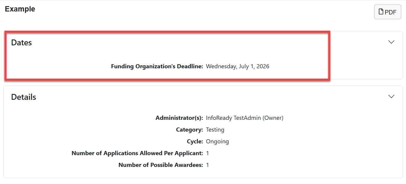 Applicants will only see dates administrators choose to show. In this example, that is only the Funding Organization's Deadline.
