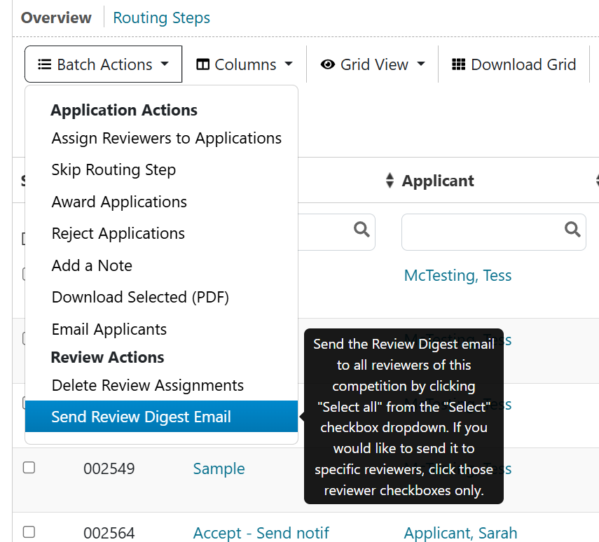 - In the Batch Actions dropdown, select Send Review Digest Email.