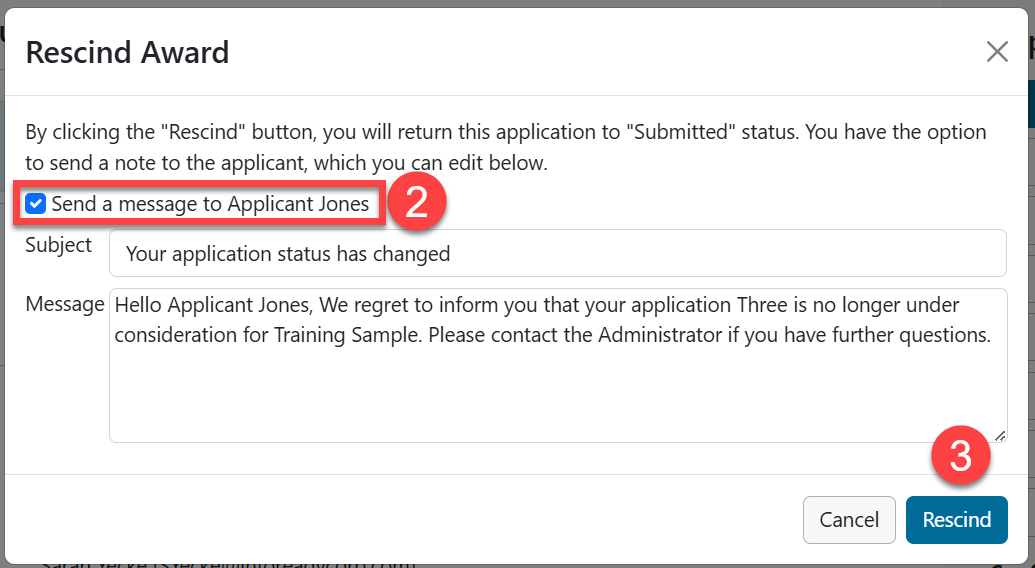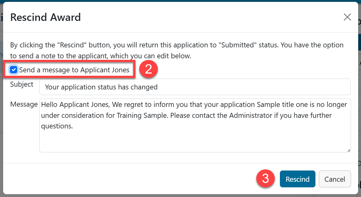 - Leave box checked but edit subject line and/or message to send notification that explains why award is rescinded.