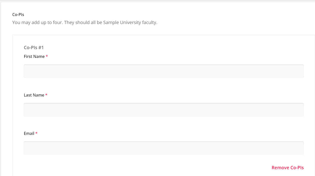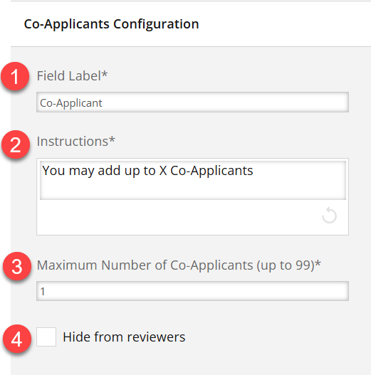 Administrators can add the Co-Applicants field as an additional requirement to any place in the form. This question allows applicants to list other individuals involved with their submission.