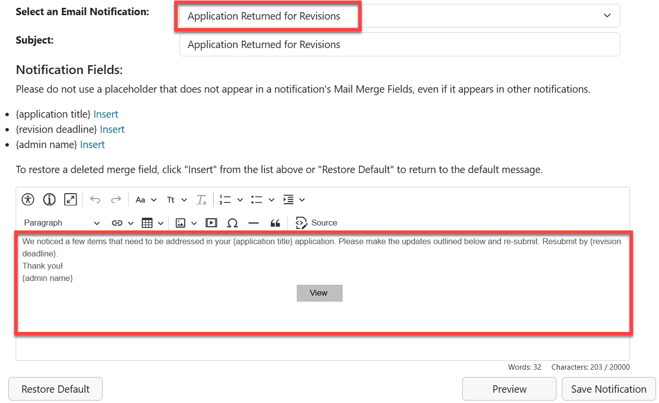 - The applicants will receive the message from the "Application Returned for Revisions" email template. (The default message for that template is shown below).