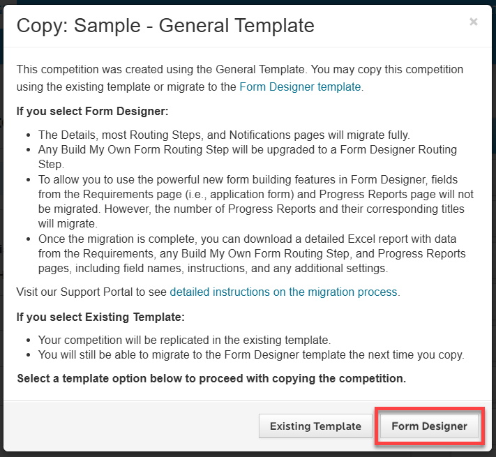 Beginning July 1, 2026, you will no longer be able to create new competitions with the Funding or General templates. However, even after 7/1 you will still be able to: - Continue to manage Funding and General template competitions (e.g., assign reviews, make final decisions, manage progress reports, etc.). - Access and extract data from Funding and General template competitions. Use the info below to help transition your existing opportunities and templates now to make the most of the upgraded Form Designer Template (FDT) capabilities! You may also want to sign up for our webinar dedicated to this topic on Tuesday, 2/10 at 1pm ET. Sign up here.