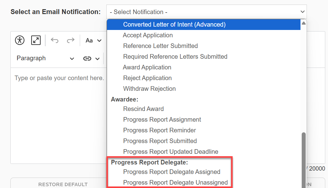 Note: These email templates will only be used if administrators or awardees choose to add users as delegates to a progress report. These email templates can be edited at any time, but they are sent automatically when users are added or removed as delgates.- Progress Report Assigned - Sent when a user is added to a progress report to assist with submission