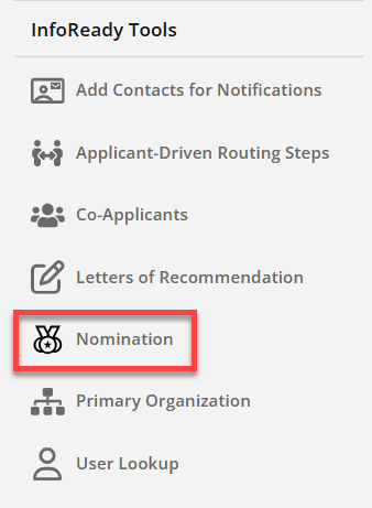 - From the Requirements page of any opportunity made from the Form Designer Template, in the InfoReady Tools section, there will be a Nomination icon: